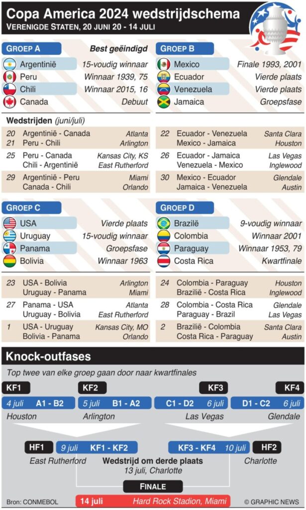 20 juni 2024 – 14 juli 2024 – Titelverdediger Argentinië trapt hun campagne tegen Canada af in Atlanta, met als doel de prestatie van Spanje uit 2012 te evenaren door een continentale titel te winnen aan weerszijden van het in de wacht slepen van de FIFA Wereldbeker-trofee.