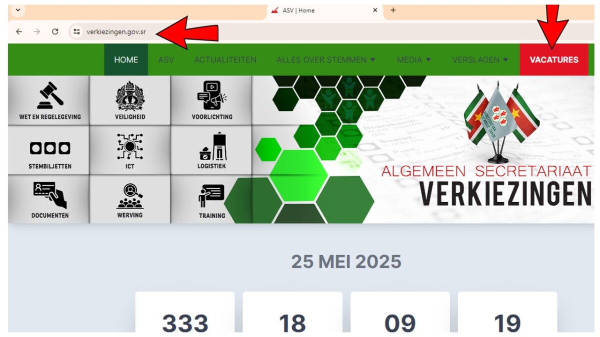 - Ga naar de website: Bezoek verkiezingen.gov.sr en klik op ‘Vacatures’.