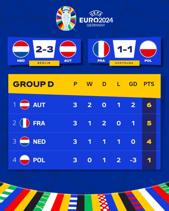 Oostenrijk verraste met een 3-2 overwinning op Nederland en eindigde bovenaan Groep D van de UEFA Euro 2024, vóór Frankrijk, dat gelijktijdig met 1-1 tegen Polen speelde. Ralf Rangnick’s Oostenrijk scoorde door een eigen doelpunt van Donyell Malen, gevolgd door treffers van Romano Schmid en Marcel Sabitzer. Nederland antwoordde met doelpunten van Cody Gakpo en Memphis Depay, maar kon niet voorkomen dat Oostenrijk won. Dit markeert Oostenrijks beste groepsfaseprestatie sinds Euro 2020. Marcel Sabitzer prees het resultaat, terwijl Virgil van Dijk aangaf dat Nederland veranderingen nodig heeft. Frankrijk had moeite tegen Polen maar scoorde via een Kylian Mbappe-penalty; Robert Lewandowski zette gelijk.