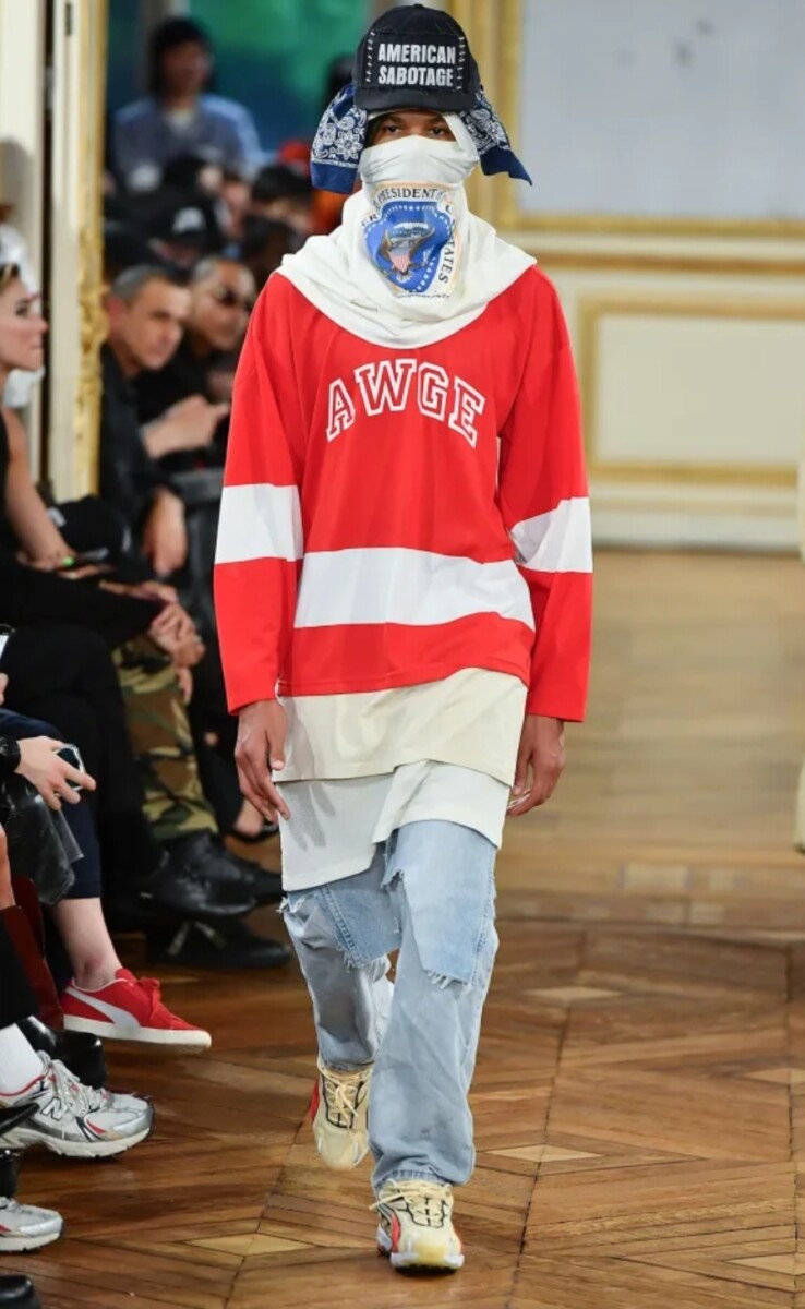 De nieuwe lijn, getiteld ‘American Sabotage’, bevindt zich op het kruispunt van kunst en activisme, waarbij de 30 looks Rocky’s idee van ‘getto-expressionisme’ onderzoeken. Gemaakt in samenwerking met de jonge ontwerpers Bede Marchand, Joshua Jamal en Coucou Bebehe, werd het extra grote gewaad beplakt met uitdrukkingen als ‘politieke satire’ en motieven zoals de Amerikaanse zeearend en de Amerikaanse vlag.
