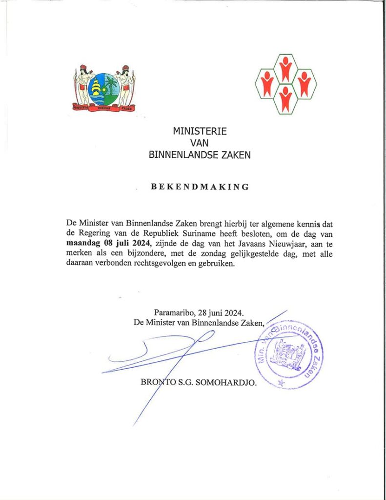 Het ministerie van Binnenlandse Zaken kondigt in onderstaande bekendmaking aan, dat maandag 8 juli een nationale vrije dag is vanwege Javaans Nieuwjaar.