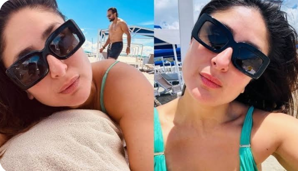 Kareena plaatste vier foto’s van zichzelf terwijl ze aan het strand aan het zonnebaden was in een blauwgroen en goudkleurig badpak.