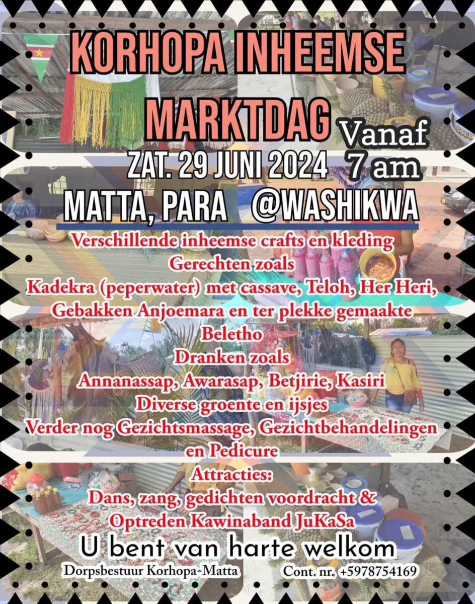 Vandaag is er in het inheemse dorp Matta in Para een heel mooie markt met inheemse producten van de bewoners van de gemeenschap. Voornamelijk kleine lokale ondernemers zullen hun producten showcasen. Onder andere gaat het dan om bijvoorbeeld de conservering en verwerking van agrarische producten die de inheemsen verbouwen in de districten zoals ananas. Er zijn heel veel middelen beschikbaar in de internationale financiële wereld om inheemse producten te promoten. We denken dan in Suriname aan producten die typisch voorkomen in specifieke gebieden en bij bepaalde stammen en volken. Deze producten moeten met behulp van EZ, ROS en LVV op een rijtje worden gezet.