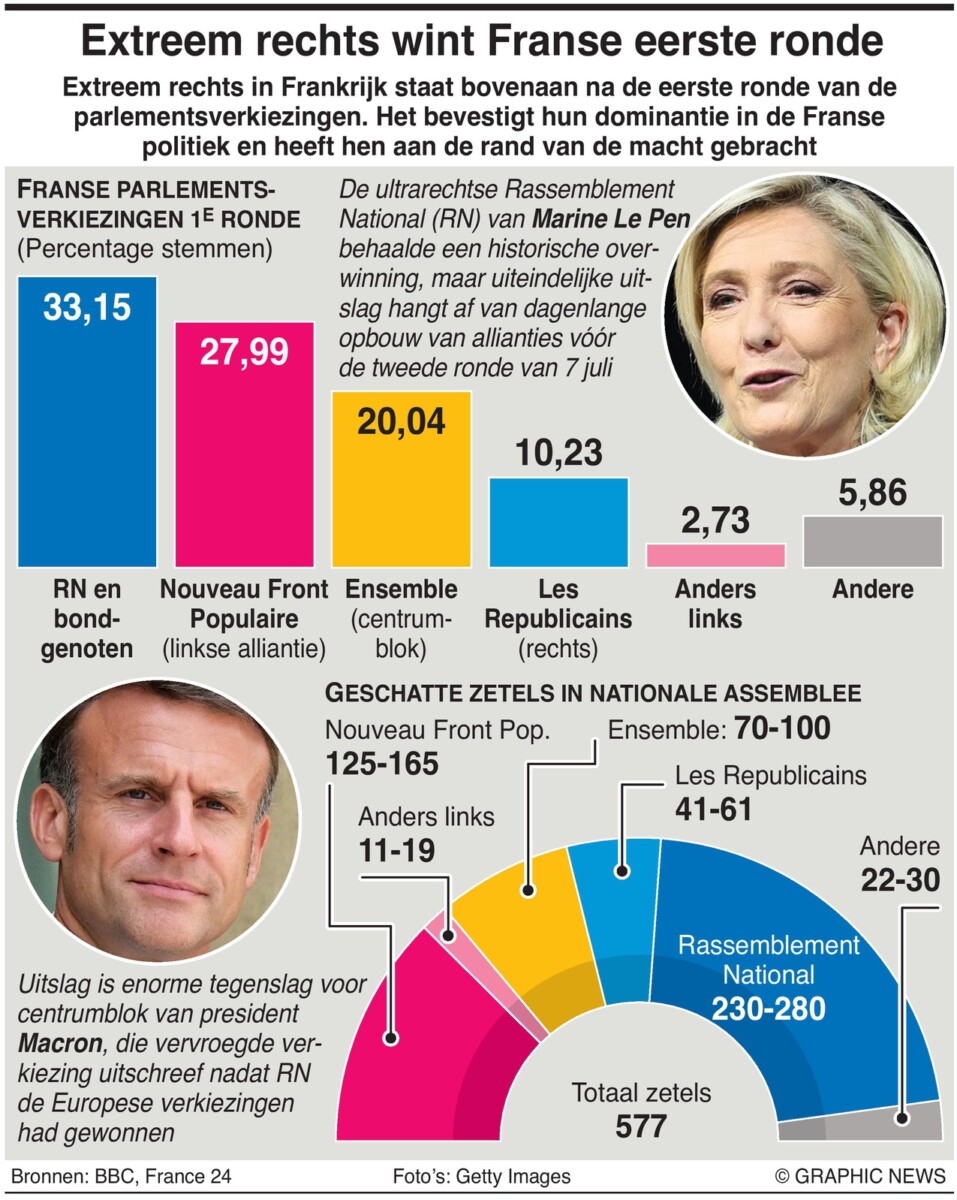 Dat was een enorme tegenslag voor Macron, die de vervroegde verkiezingen had uitgeschreven nadat zijn ticket vorige maand door de RN was afgewezen bij de verkiezingen voor het Europees Parlement.