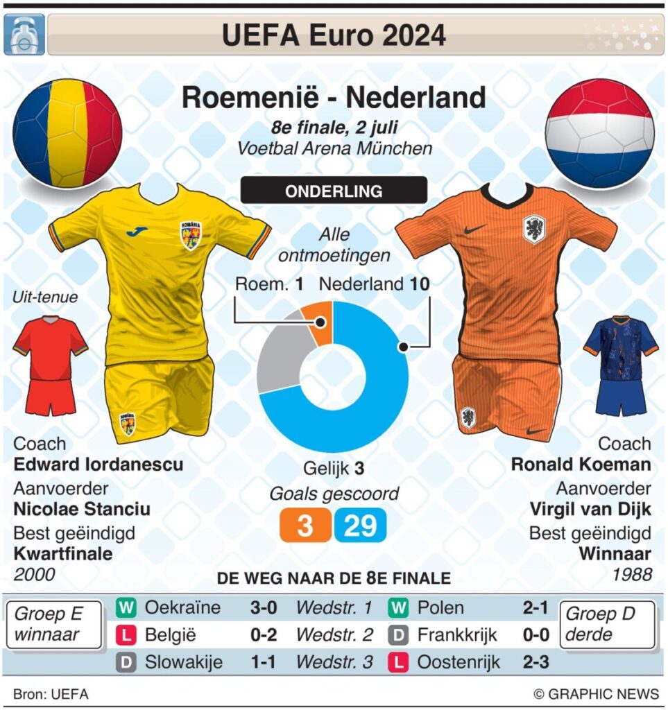 29 juni 2024 – 2 juli 2024 – De knock-outfase van UEFA Euro 2024 begint wanneer wereldkampioenen Frankrijk, gastland Duitsland, Spanje en Portugal allemaal voor een moeilijke route naar de finale staan. In de Laatste 16 speelt Roemenië op 2 juli in München tegen Nederland.