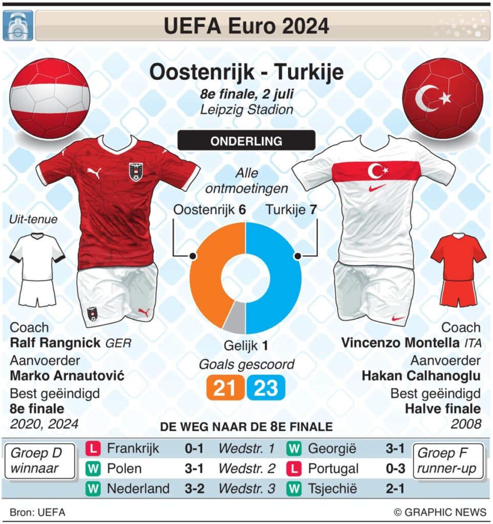 29 juni 2024 – 2 juli 2024 – De knock-outfase van UEFA Euro 2024 begint wanneer wereldkampioenen Frankrijk, gastland Duitsland, Spanje en Portugal allemaal voor een moeilijke route naar de finale staan. In de Last 16 staat Oostenrijk op 2 juli in Leipzig tegenover Türkiye.