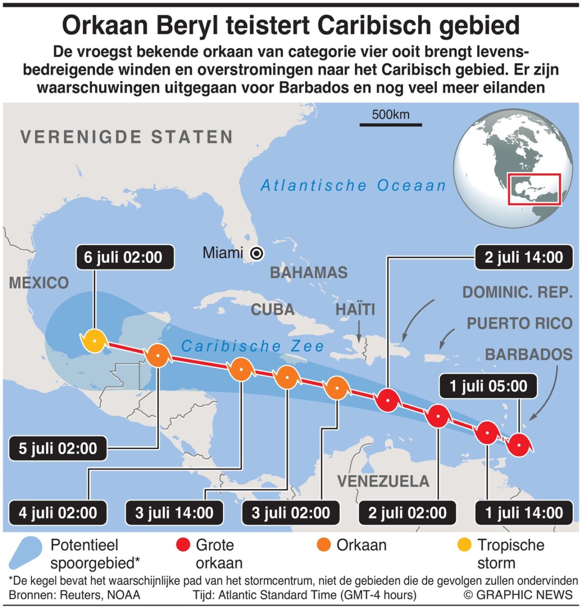 Het National Hurricane Center beschrijft Beryl als “extreem gevaarlijk”, met waarschuwingen voor Barbados, St. Lucia, St. Vincent en de Grenadines, Grenada en Tobago, Dominica, Trinidad, de Dominicaanse Republiek en Haïti.