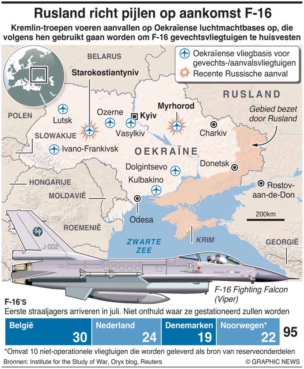 Ambtenaren hebben niet onthuld waar de F-16’s zullen worden gestationeerd, maar Moskou zei na een aanval op de vliegbasis Starokostiantyniv afgelopen donderdag dat het zich had gericht op vliegvelden waarvan het dacht dat ze daar zouden huisvesten.