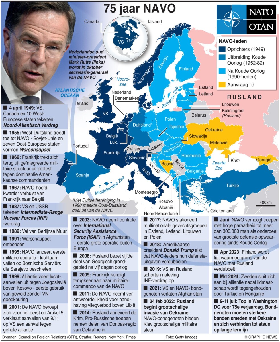 De Noord-Atlantische Verdragsorganisatie (NAVO), opgericht in 1949 als bolwerk tegen de Sovjet-Unie, blijft vijfenzeventig jaar later de pijler van de militaire samenwerking tussen de VS en Europa.