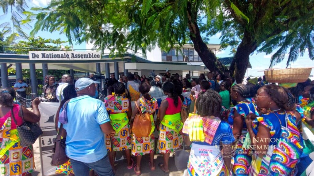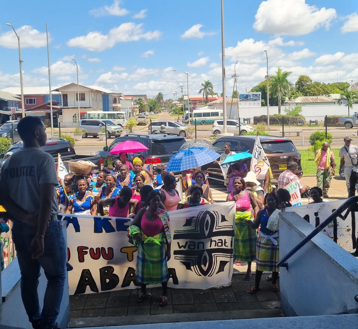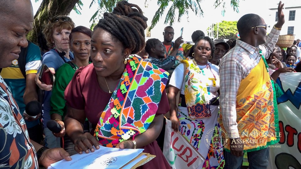De Vereniging van Saamaka Gemeenschappen (VSG) ging woensdag richting het Kabinet van de Oresident, Chandrikapersad Santokhi, om een petitie voor de bescherming van het bos te overhandigen. “Mi matu, Mi Leti,” wat neerkomt op “mijn bos, mijn recht,” was hun slogan. De petitie werd ontvangen door een vertegenwoordiger van het Kabinet. Daarna zou de petitie worden overhandigd aan De Nationale Assemblee, waarna de groep zich ook richtte tot het kabinet van de vicepresident.