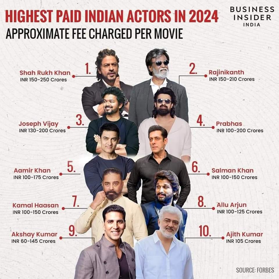 Volgens Forbes zijn de hoogstbetaalde Bollywood-acteurs van 2024 Shah Rukh Khan, Akshay Kumar en Salman Khan. Deze sterren domineren de Indiase filmindustrie met hun indrukwekkende verdiensten dankzij filmrollen, merkdeals en andere zakelijke ondernemingen.