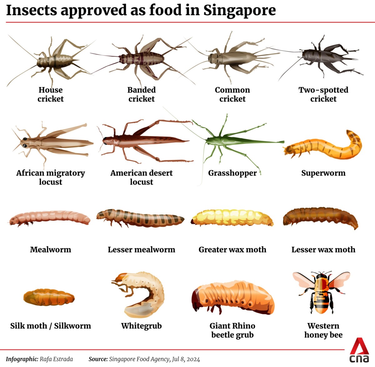 Maandag liet de Singapore Food Agency (SFA) weten dat zestien soorten insecten, waaronder krekels en zijderupsen, zijn goedgekeurd voor menselijke consumptie.