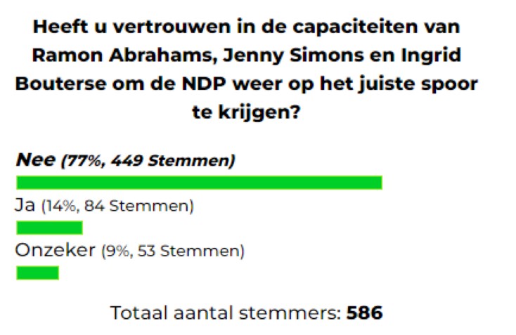 Dagblad Suriname heeft via een webpeiling onderzocht of het publiek vertrouwen heeft in de capaciteiten van Ramon Abrahams, Jenny Simons en Ingrid Bouterse om de NDP weer op het juiste spoor te krijgen.