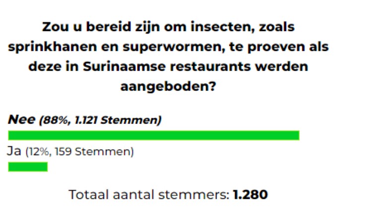 Dagblad Suriname stelde deze vraag aan het publiek in een recente webpeiling: “Zou u bereid zijn om insecten, zoals sprinkhanen en superwormen, te proeven als deze in Surinaamse restaurants werden aangeboden?”