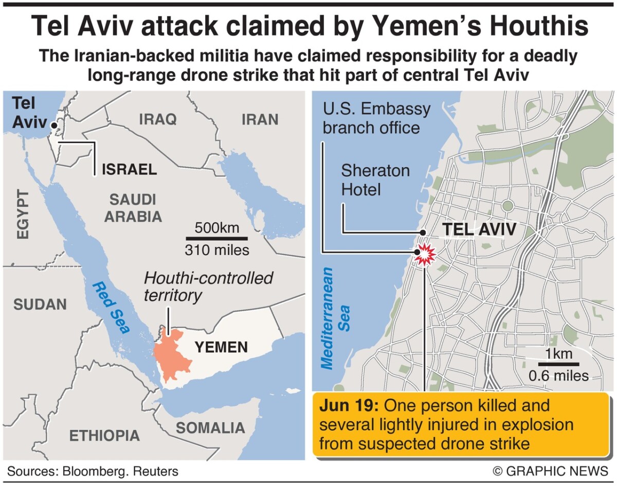 Een langeafstandsdrone trof vrijdag de Israëlische stad Tel Aviv, tijdens een aanval opgeëist door de door Iran gesteunde Houthi-militie, waarbij één persoon werd gedood en verschillende anderen gewond raakten.