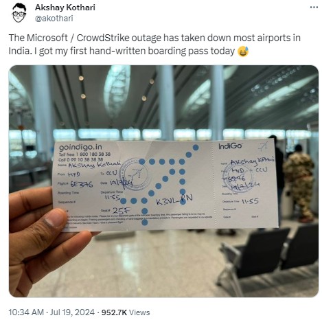 Instapkaarten op Indiase luchthavens worden handmatig ingevuld vanwege een wereldwijde IT-storing.