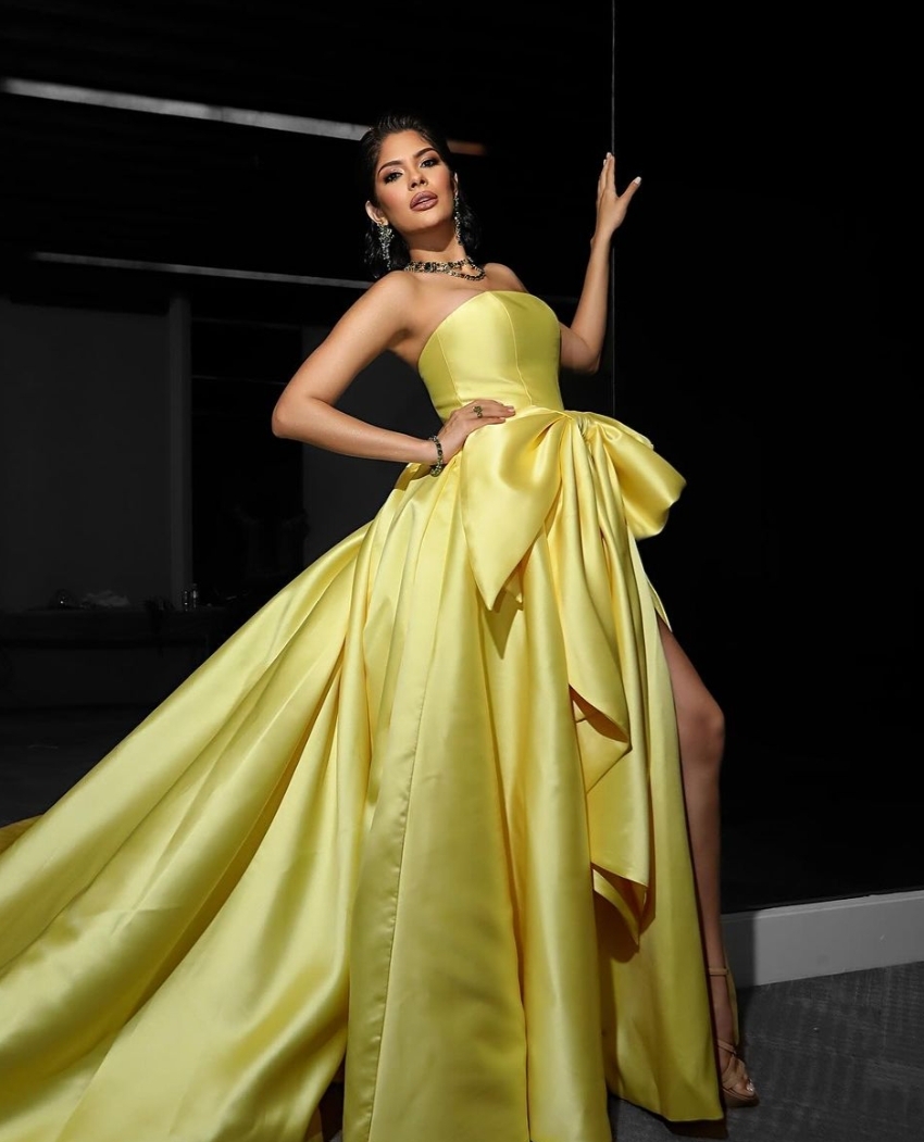 In een recente Instagram-post in samenwerking met Miss Universe poseerde Palacios in een prachtige gele jurk van ontwerpster Nathalie Kriado.