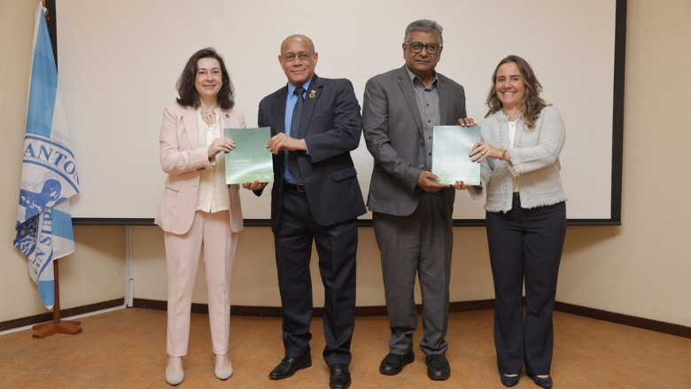 (Foto bijschrift: Van links naar rechts World Bank Resident Representative in Suriname, Diletta Doretti, minister van Arbeid, Werkgelegenheid en Jeugdzaken, Steven Mac Andrew, minister van Financiën en Planning, Stanley Raghoebarsingh en Gisele Texeira, Country Economist van de IDB)