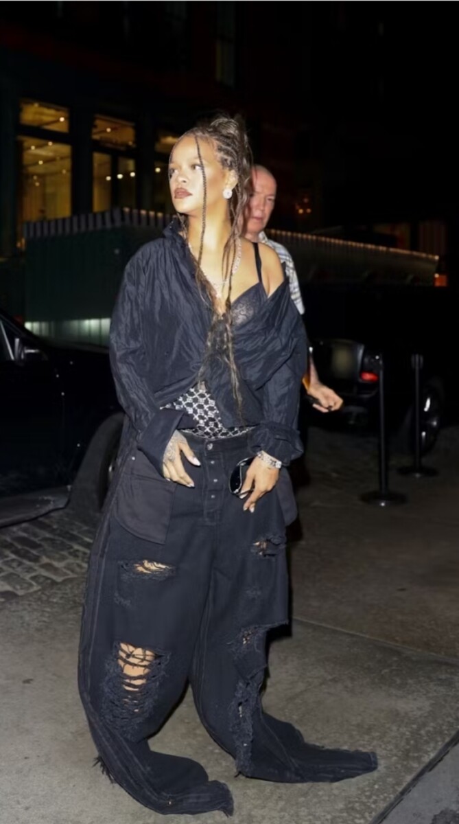 De vlechten zelf zijn prachtig, maar de manier waarop Rih ze voor de gelegenheid heeft gestyled is net zo opmerkelijk. Toen Rihanna samen met ASAP Rocky SoHo’s Mercer Hotel verliet, stapte ze de kasseien op in een overdreven wijde spijkerbroek met een bijpassend marineblauw button-down-topje.