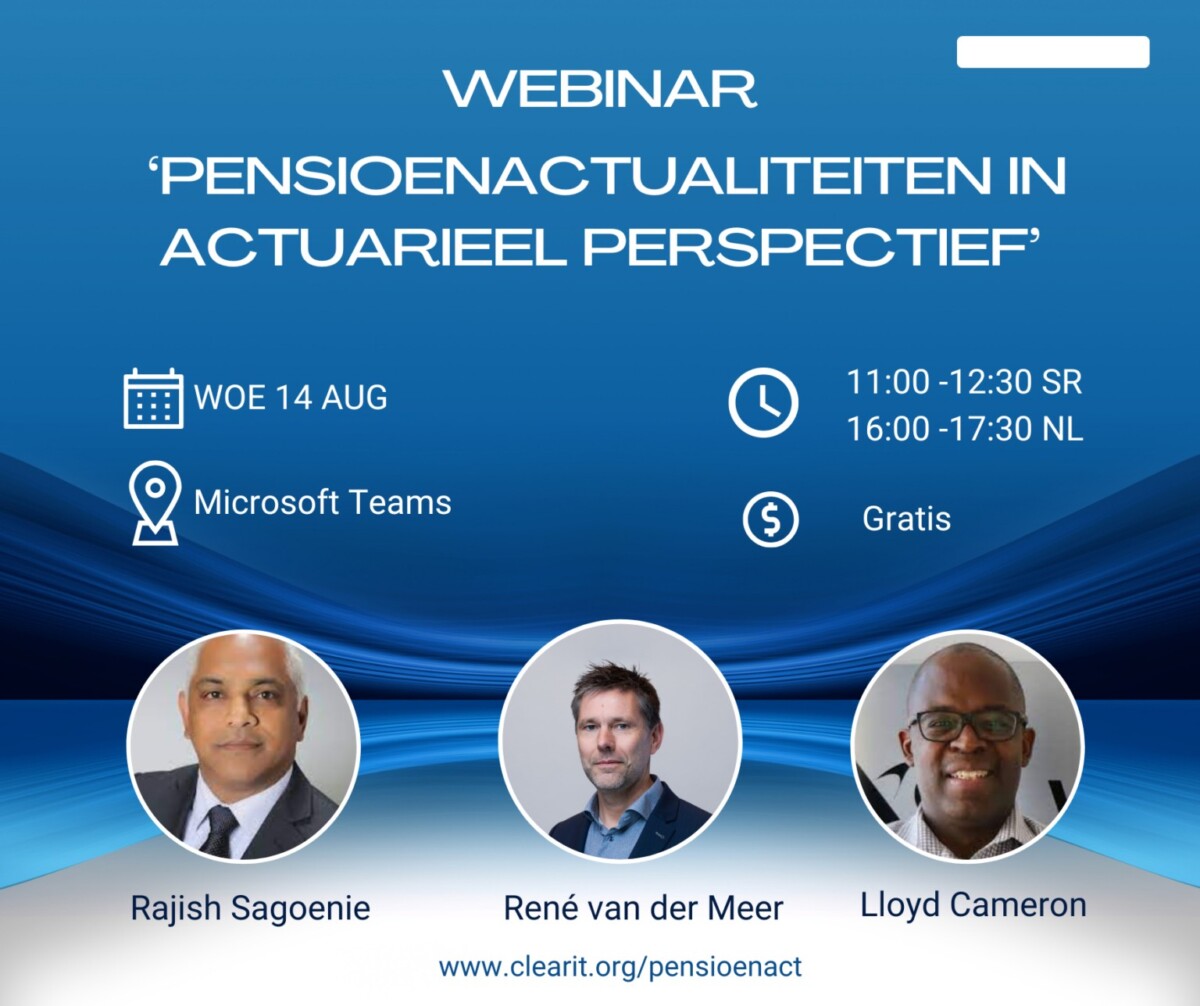 Op woensdag 14 augustus organiseert Clear It het webinar “Pensioenactualiteiten in actuarieel perspectief”. Tijdens dit webinar wordt ingegaan op de laatste ontwikkelingen binnen de pensioensector zowel in Nederland als met name ook in Suriname.