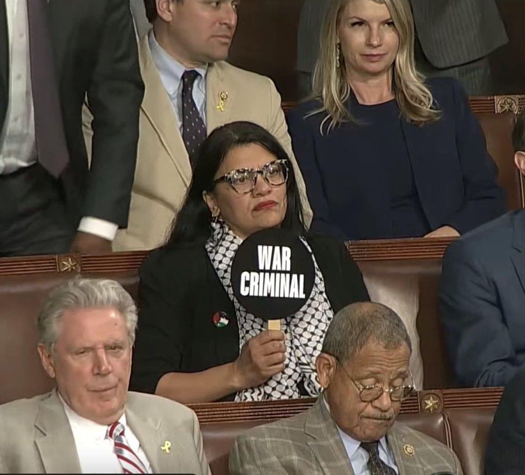 Kort na de toespraak van de IsraĆ«lische premier Benjamin Netanyahu voor het Congres ā door Nancy Pelosi bestempeld als de ergste ooit door een buitenlandse leider ā haalden pro-Palestijnse demonstranten de Amerikaanse vlag neer buiten Union Station in Washington DC.