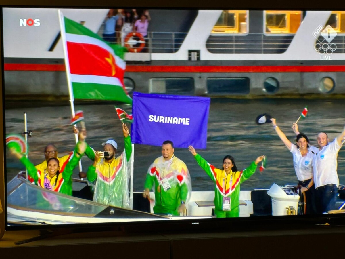 Team Suriname met badmintonner Sören Opti, sprinter Jalen Lisse, baanwielrenner Jair Tjon-En-Fa, zwemmers Irvin Hoost en Kaelyn Djoparto en de Chef de Mission Ranoe Samlal hebben vrijdag samen op de boot over de Seine de officiele entree gemaakt in Parijs voor hun deelname aan de Olympische Spelen.