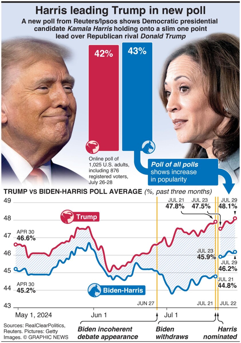 31 juli 2024 – Een nieuwe peiling van Reuters/Ipsos laat zien dat de Democratische presidentskandidaat Kamala Harris een kleine voorsprong van één punt heeft op haar Republikeinse rivaal Donald Trump.