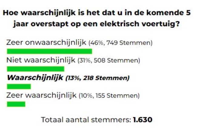 De vraag was: “Hoe waarschijnlijk is het dat u in de komende 5 jaar overstapt op een elektrisch voertuig?” De reacties zijn alsvolgt: