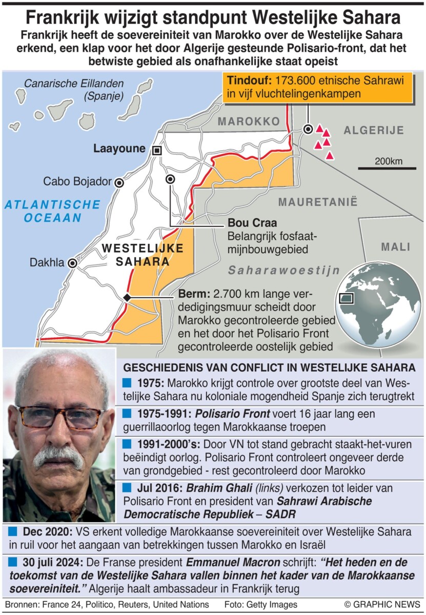 De zet is een klap voor het pro-onafhankelijkheidsfront Polisario, dat het gebied al tientallen jaren claimt als thuisbasis van de Sahrawi Arabische Democratische Republiek (SADR). Algerije riep dinsdag haar ambassadeur in Frankrijk “met onmiddellijke ingang” terug.