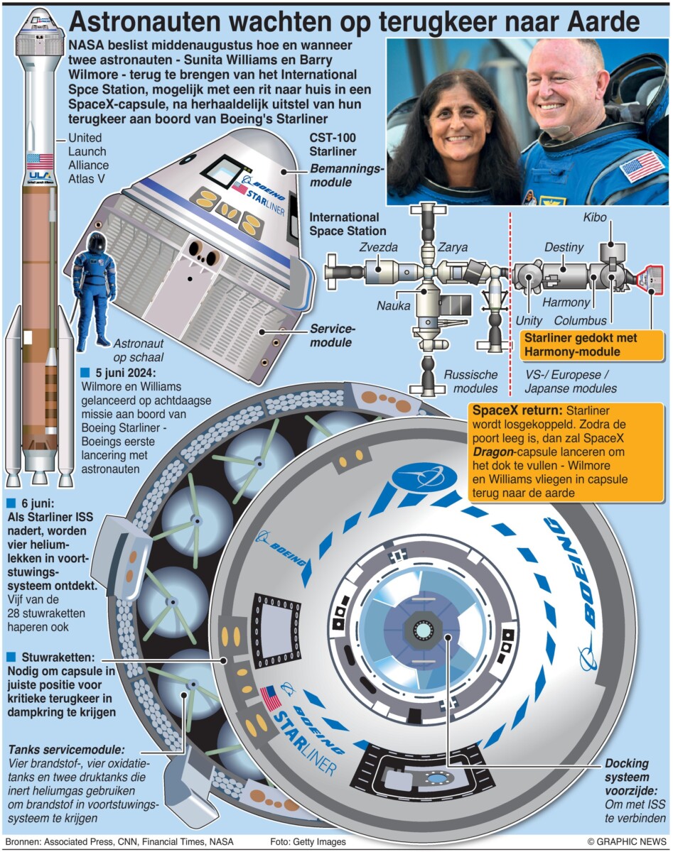 Marineveteranen Wilmore en Williams vlogen op 5 juni naar het ISS met Boeing’s Starliner, de eerste bemande lancering van het vaartuig. Ze zijn nog steeds op het station en wachten tot NASA erachter komt hoe ze terug naar de aarde kunnen.