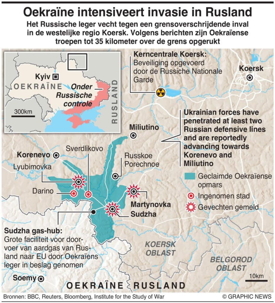 De waarnemend gouverneur meldde aan president Poetin dat de situatie in de regio Koersk ernstig is, met 28 nederzettingen onder Oekraïense controle en een invasie van 12 kilometer diep en 40 km breed. Ongeveer 121.000 mensen zijn gevlucht. Tot nu toe zijn 12 mensen gedood en 121 gewond door de aanvallen, waaronder 10 kinderen. In het district Belovsky werden chemische wapens gebruikt. President Poetin verklaarde dat Kiev de destabilisatie van Russische grensgebieden zoals Bryansk voortzet en het Westen Oekraïne gebruikt tegen Rusland. Poetin benadrukte dat er geen gesprekken mogelijk zijn met een regime dat burgers aanvalt en verzekerde een rechtvaardige reactie op de invasie.