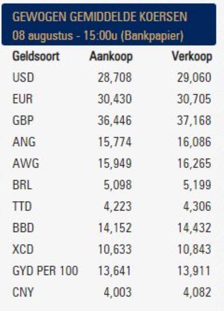 De wisselkoers van de USD ligt al enkele weken onder de SRD 30. De koers noteerde donderdag SRD 29,06 voor de USD. Bij girale transacties is de koers zelfs lager, namelijk SRD 28,84.