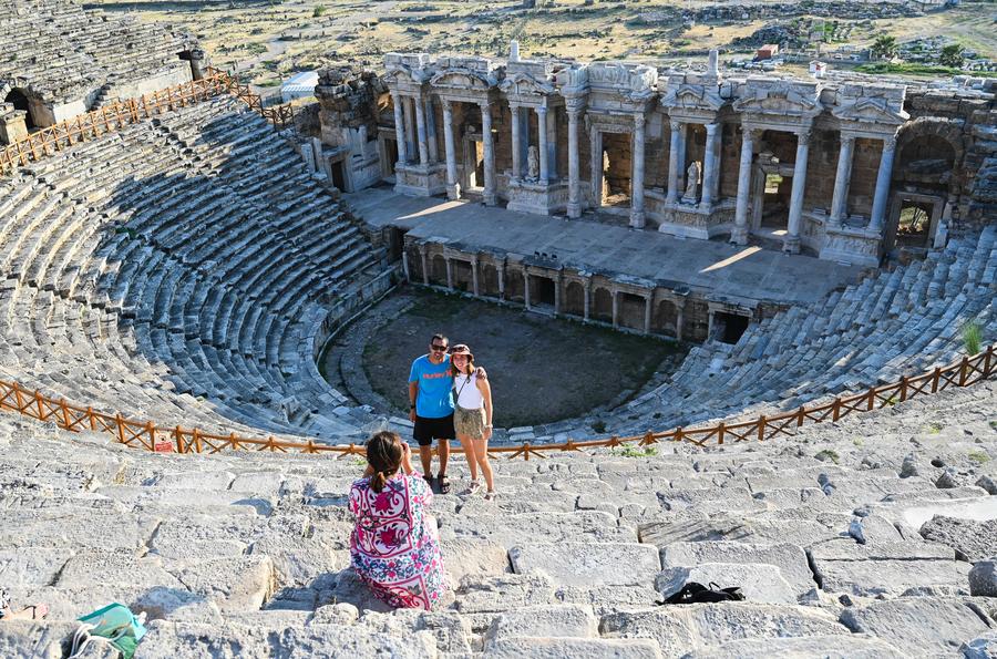 Toeristen bezochten in augustus 2024 massaal de ruïnes van Hierapolis in Denizli, Turkije, een UNESCO-werelderfgoedlocatie. Hierapolis, gesticht rond 190 v.Chr., staat bekend om zijn thermale bronnen en indrukwekkende travertijnterrassen. Tijdens de Romeinse periode was het een belangrijk centrum van cultuur en handel, met opmerkelijke bouwwerken zoals een groot theater, een immense necropolis en de tempel van Apollo. Recente foto’s tonen toeristen die genieten van de historische ruïnes en artefacten van Hierapolis. Luchtfoto’s laten de omvang en schoonheid van deze antieke stad zien, die toeristen blijft aantrekken met zijn rijke geschiedenis en adembenemende landschappen.