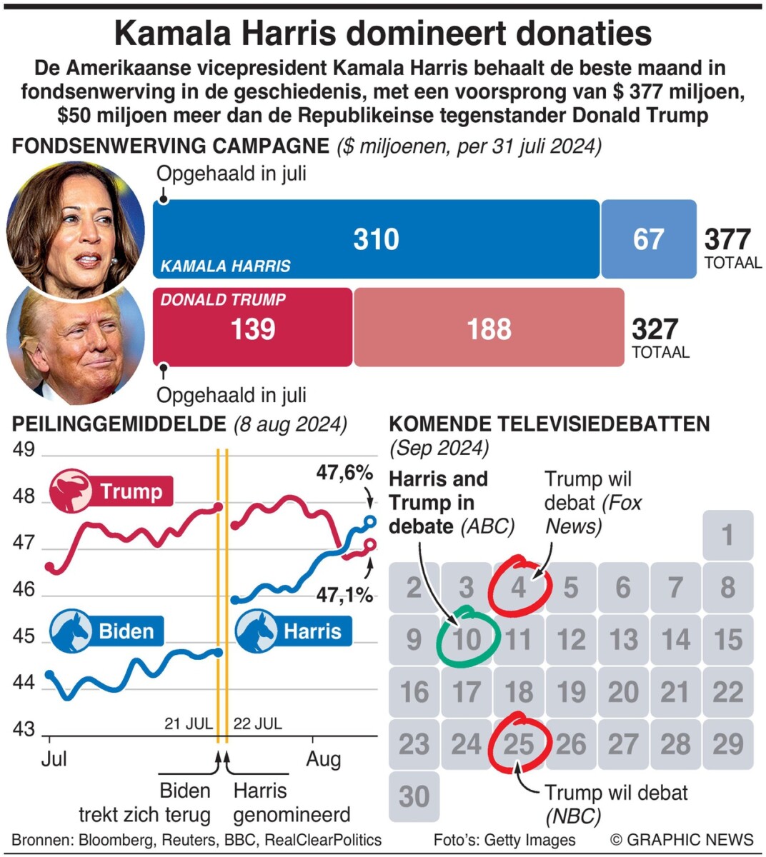 Volgens het gemiddelde van de peilingen van RealClearPolitics van 8 augustus heeft Harris een kleine voorsprong van een half procentpunt op Trump: 47,6% tegen 47,1%.