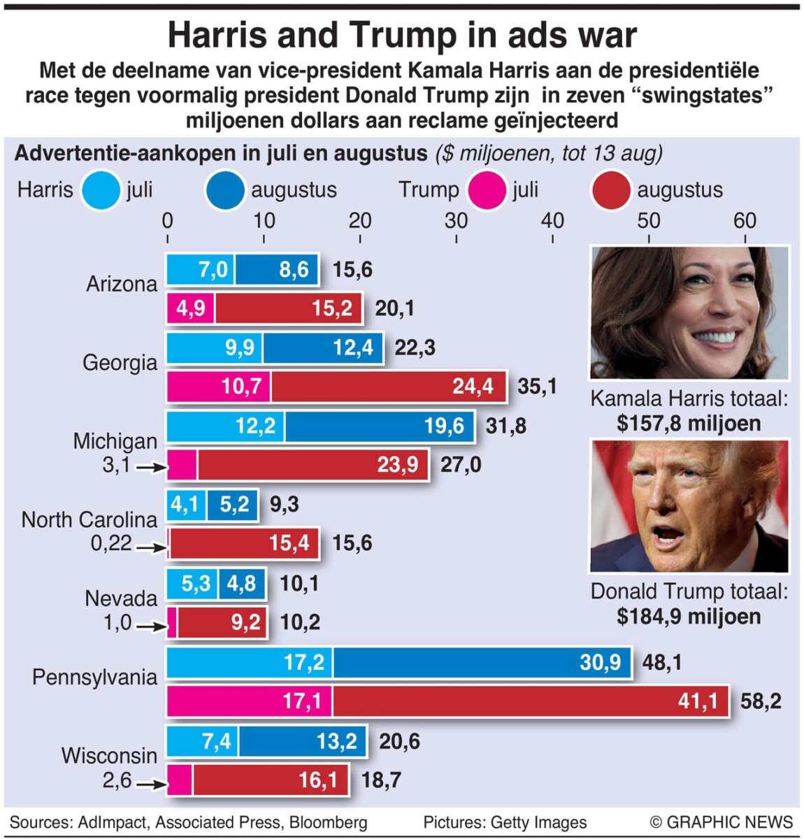 15 augustus 2024 – De deelname van vicepresident Kamala Harris aan de presidentsrace tegen voormalig president Donald Trump heeft miljoenen dollars aan advertenties in zeven swing states gepompt.