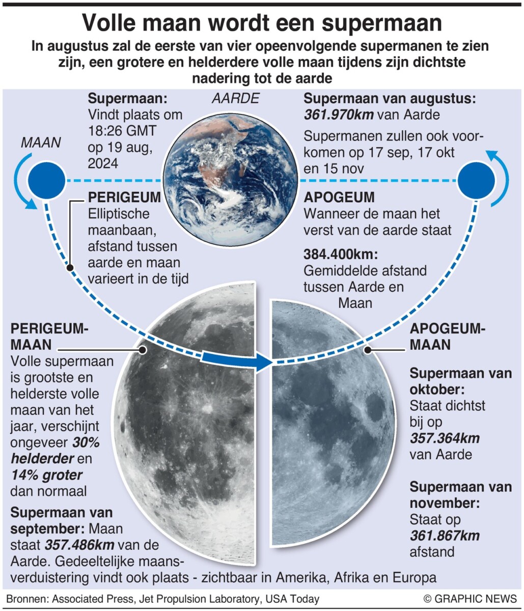 16 augustus 2024 – In augustus zal de eerste van vier opeenvolgende supermanen plaatsvinden: een grotere en helderdere volle maan die plaatsvindt tijdens de dichtstbijzijnde nadering van de aarde.
