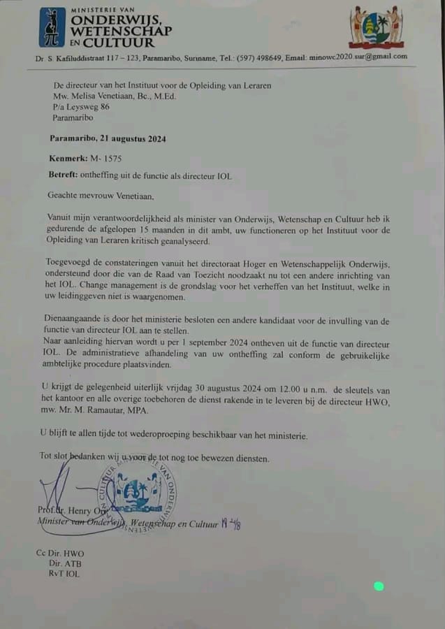In een officiële brief gedateerd 21 augustus heeft het ministerie van Onderwijs, Wetenschap en Cultuur aangekondigd, dat Melisa Venetian per 1 september 2024 wordt ontheven uit haar functie als directrice van het Instituut voor de Opleiding van Leraren (IOL).