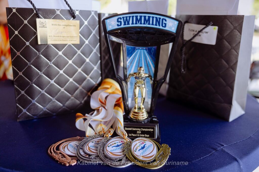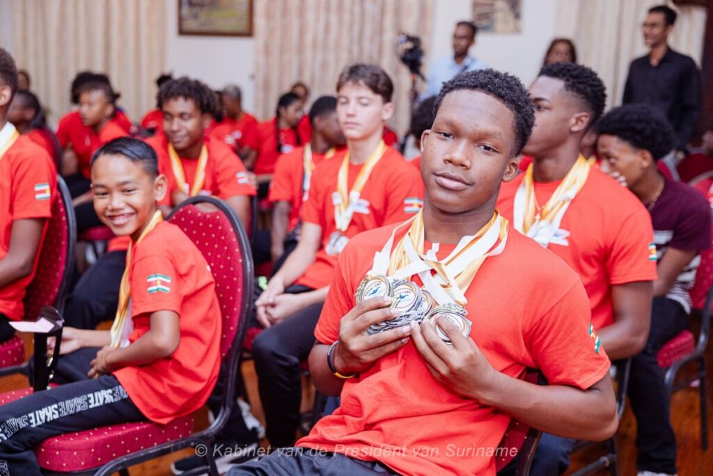 President Chandrikapersad Santokhi heeft vrijdag 23 augustus jonge zwemmers gehuldigd in het presidentieel paleis voor hun uitzonderlijke prestaties op de GOODWILL Zwemkampioenschappen 2024 in St. Lucia.