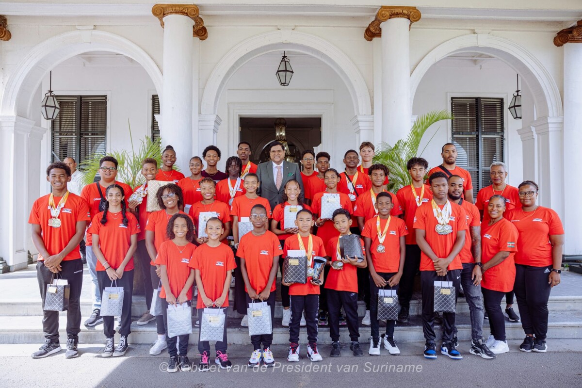 President Chandrikapersad Santokhi heeft vrijdag 23 augustus jonge zwemmers gehuldigd in het presidentieel paleis voor hun uitzonderlijke prestaties op de GOODWILL Zwemkampioenschappen 2024 in St. Lucia.