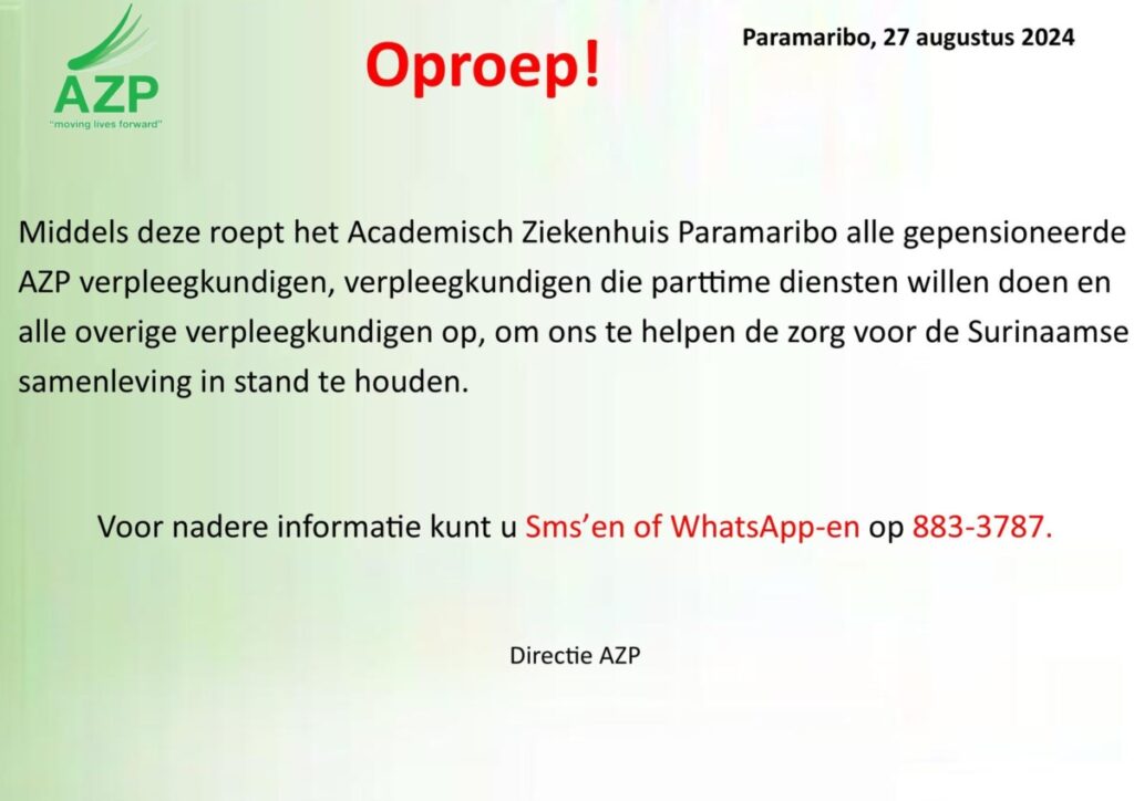 Het Academisch Ziekenhuis Paramaribo (AZP) verkeert in crisis door een ernstig tekort aan zorgpersoneel. Sinds januari zijn 88 verpleegkundigen vertrokken, met een verwacht totaal van 180 tegen het einde van het jaar. Vorig jaar verlieten 107 verpleegkundigen het AZP.