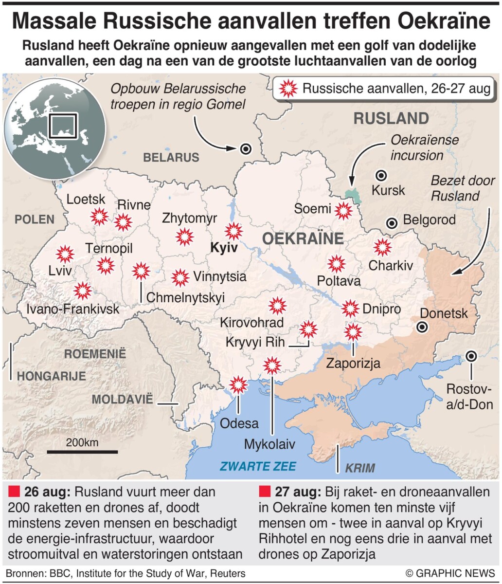 27 augustus 2024 – Rusland lanceerde meerdere golven van raket- en droneaanvallen op tientallen Oekraïense regio’s, een dag na Moskou’s grootste luchtaanval van de oorlog op zijn buurland.