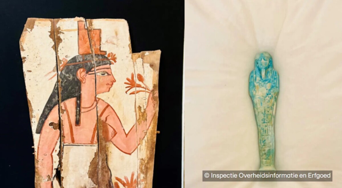 Het hoofd stamt uit de periode 170 tot 45 jaar voor Christus en was lange tijd in het bezit van een Nederlandse verzamelaar, meldt de Inspectie Overheidsinformatie en Erfgoed. Verder gaat het om een shabti (grafbeeldje) uit 664 tot 525 voor Christus en een schildering van de Egyptische godin Isis uit de Romeinse periode (30 voor Christus tot 642 na Christus). Deze goederen zijn tien jaar geleden illegaal meegenomen uit Egypte en na onderzoek door de politie vrijwillig afgestaan door de handelaar bij wie de stukken zijn ontdekt.