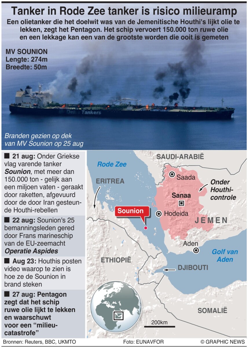 Een grootschalig olielek zou de eerste ernstige milieuschade betekenen als gevolg van de campagne die de Houthi’s sinds november voeren tegen de internationale scheepvaart in de Rode Zee.