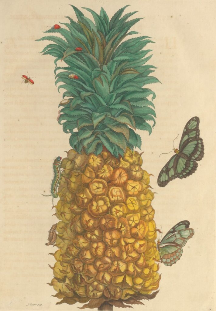 “De eerste druk van de Metamorphosis werd in 1705 door Merian in Amsterdam uitgegeven, en naar keuze gebonden met een Latijnse of Nederlandse tekst. Het boek bevat 60 handgekleurde platen van onder meer rupsen, vlinders en spinnen die zijn afgezet (ingekleurd) met diepe kleuren en rijke schakeringen. Bijzonder is dat er ook beschrijvingen zijn van de omstandigheden waarin de informatie werd verzameld. Merian maakte gebruik van de kennis van tot slaaf gemaakte mensen en de oorspronkelijke bewoners van Suriname”, zo is te lezen op de website van het Rijksmuseum.