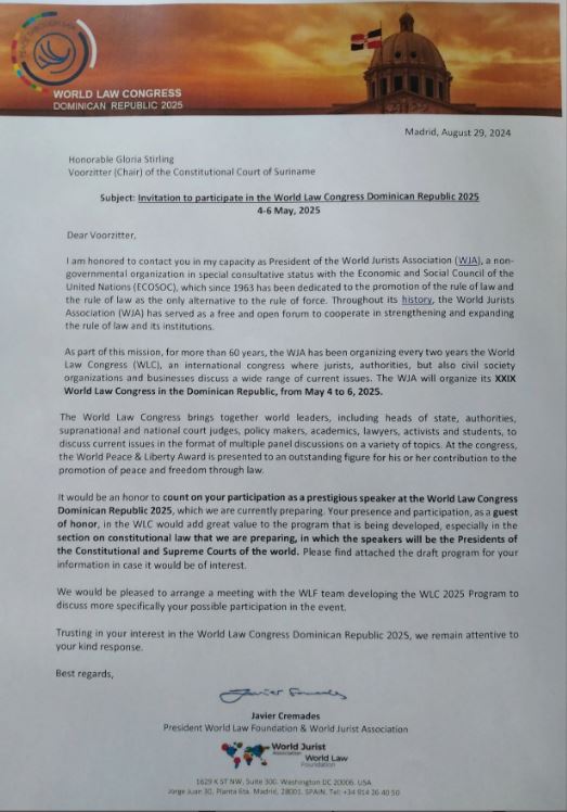 Gloria Stirling, president van het Constitutioneel Hof van Suriname, kondigde aan dat het Constitutioneel Hof in oktober 2025 zal toetreden als lid van de Wereldconferentie over Constitutionele Rechtvaardigheid (WCCJ) in Madrid.