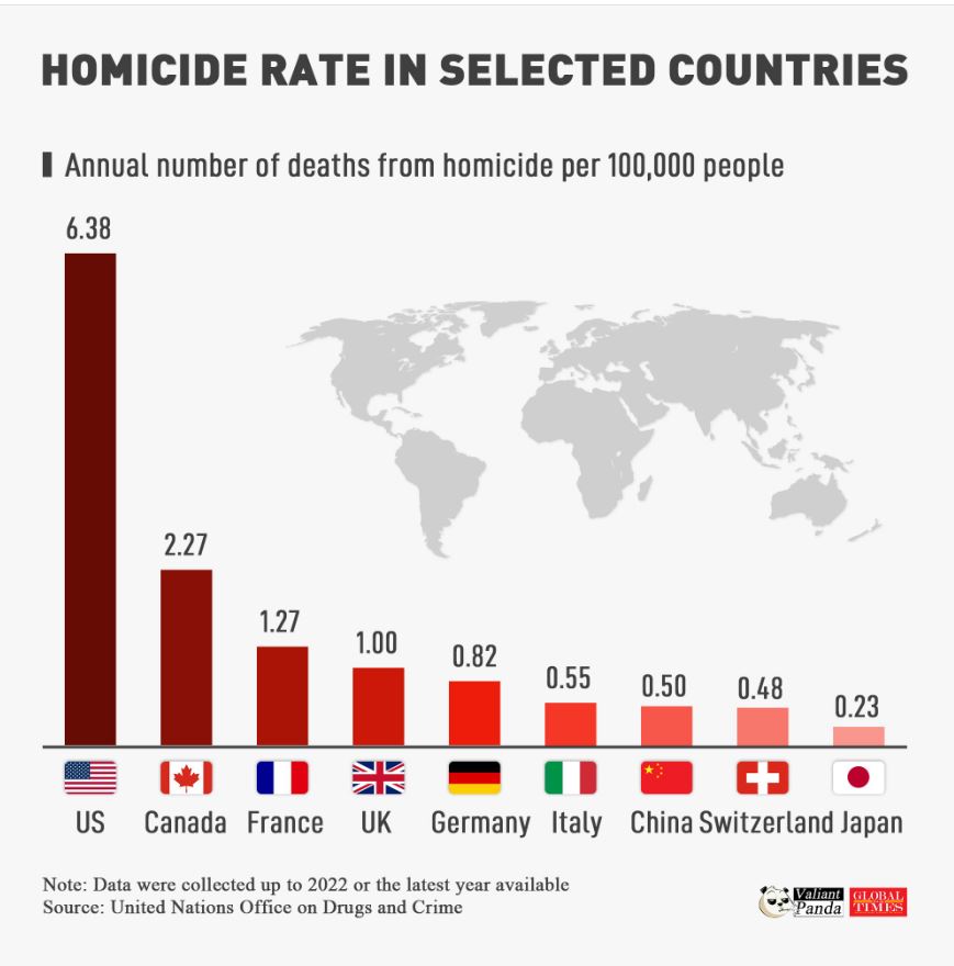 De realiteit is dat de kans 13 keer groter is dat je in de VS te maken krijgt met geweld of een moord dan in China. Dat is de norm. Je kunt dus geweld vinden in China. Maar dat is minder per hoofd van de bevolking dan in Canada, minder dan in Frankrijk, minder dan in Groot-Brittannië, minder dan in Duitsland en minder dan in Italië. Ongeveer vergelijkbaar met Zwitserland.