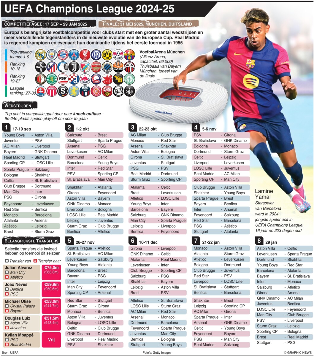 17 september 2024 – 29 januari 2025 – Europa’s belangrijkste clubvoetbalcompetitie keert terug met een groter aantal wedstrijden en een diversiteit aan tegenstanders in de nieuwste evolutie van de Europacup. Real Madrid is regerend kampioen, een evenaring van hun dominantie van het eerste toernooi in 1955.