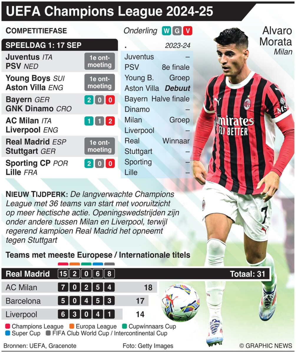17 september 2024 – Het nieuwe seizoen van de UEFA Champions League in Europa begint op 17 september en eindigt met de finale in de Allianz Arena in München op 31 mei 2025. Belangrijke wedstrijden zijn onder meer de regerend kampioen Real Madrid die het opneemt tegen Stuttgart, AC Milan dat een zwaargewichtduel met Liverpool organiseert en GNK Dinamo dat naar Bayern München reist.