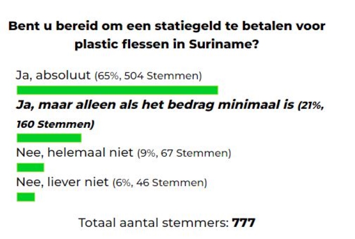 Deze resultaten laten zien dat er een breed draagvlak is voor de invoering van statiegeld in Suriname. Het invoeren van statiegeld kan een effectieve maatregel zijn om de vervuiling door plastic flessen tegen te gaan, de recycling te bevorderen en zo onze omgeving en het milieu te beschermen.