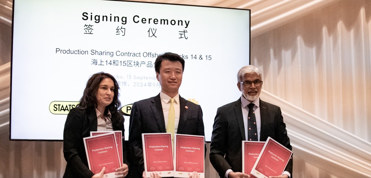 De contracten werden getekend door Staatsolie-directeur Annand Jagesar, CNPC-vertegenwoordiger Yu Zhang en POC-directeur Rekha Bissumbhar.
